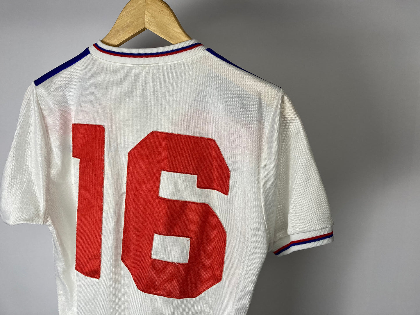 Stunning matchworn Three Lions shirt from the early '80s. Shirt is worn from 1980 to 1983. The number 16 was worn by multiple players;
