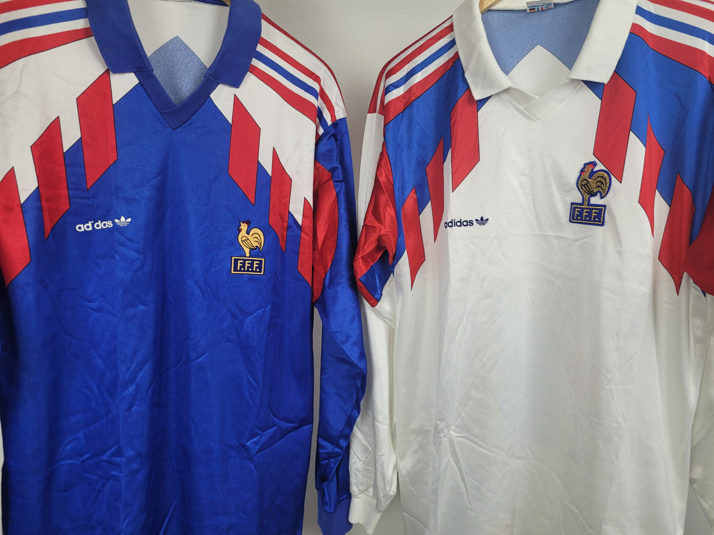 The French national team played in this beautiful adidas original football shirts from 1990 to 1992. Unfortunately, these were not very successful years for Les Bleus. They did not qualify for the World Cup ‘90 with coach Michel Plattini and in the European Cup ’92, they were eliminated in the quarterfinals by the eventual winner of the tournament, namely Denmark. Nevertheless, this are beautiful jerseys, as we have always come to expect from the French team. The jersey features the subtle and stylish Adidas characteristics.