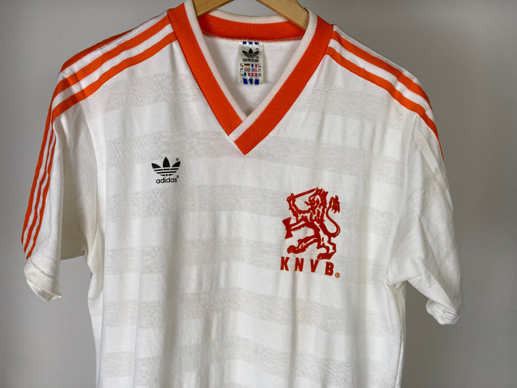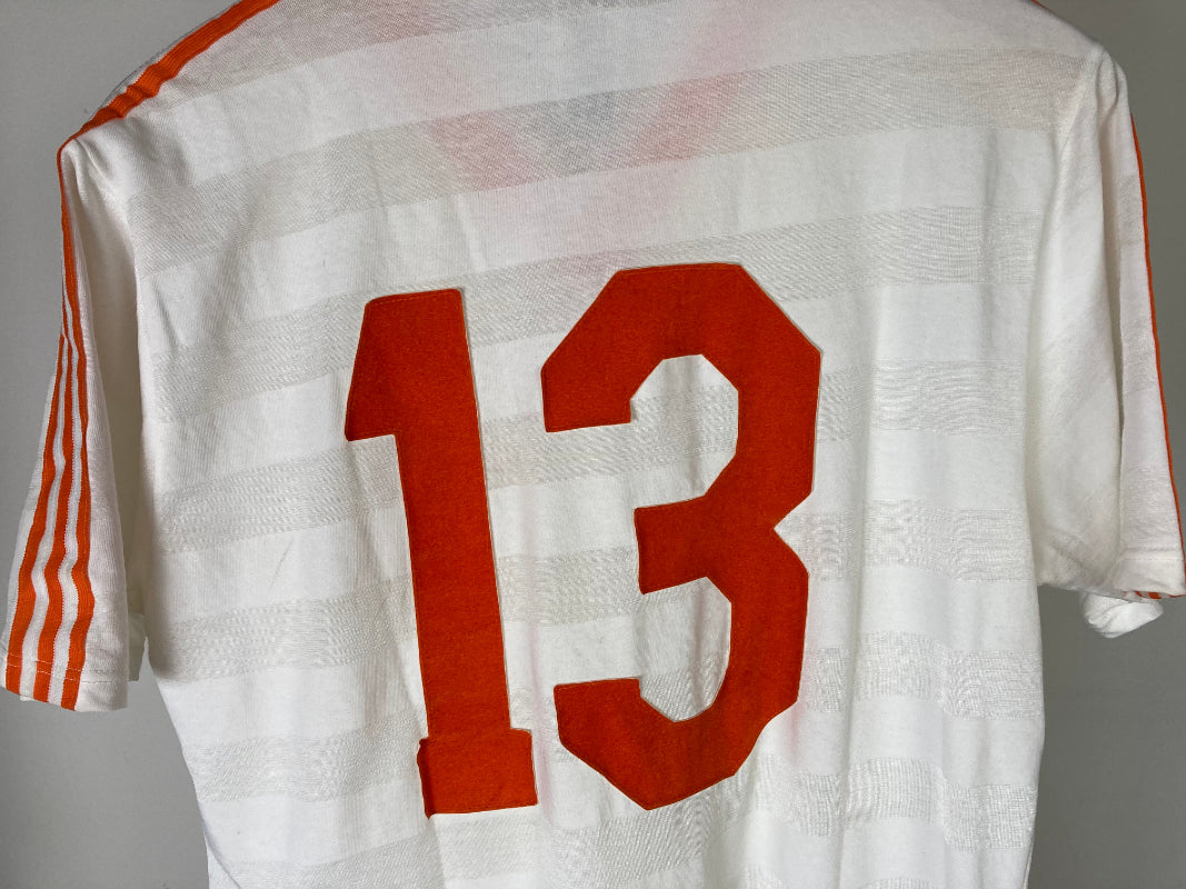 Lovely Holland away shirt used in the 1985-1986 season. The player is unknown. Great design with the white and orange details. Typical '80s Adidas template with the Horizontal stripes which are also used in the home shirt of the same season. The number 13 is sewn on the shirt.'